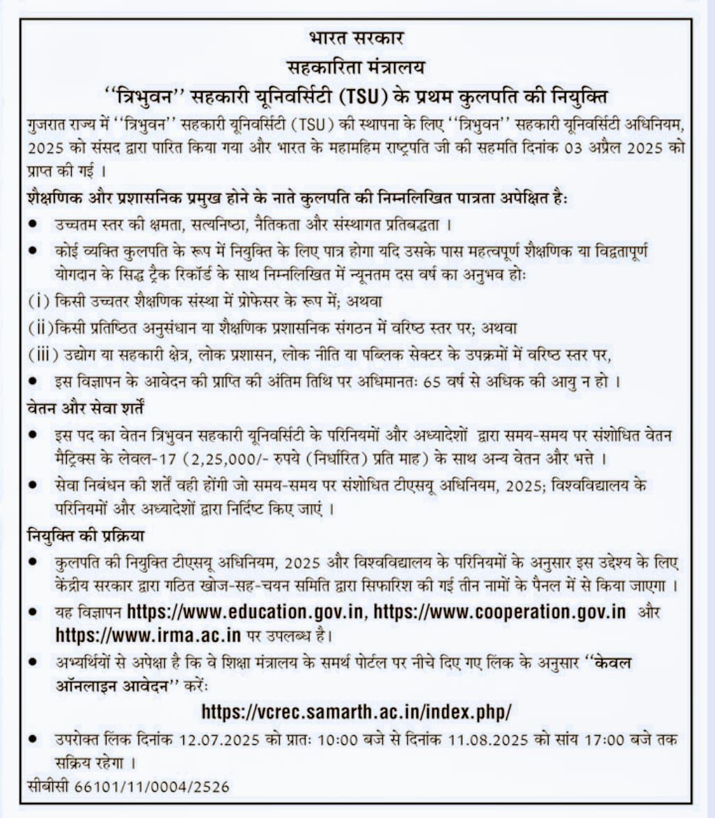 | "त्रिभुवन" सहकारी युनिवर्सिटी (TSU) के प्रथम कुलपति की नियुक्ति |